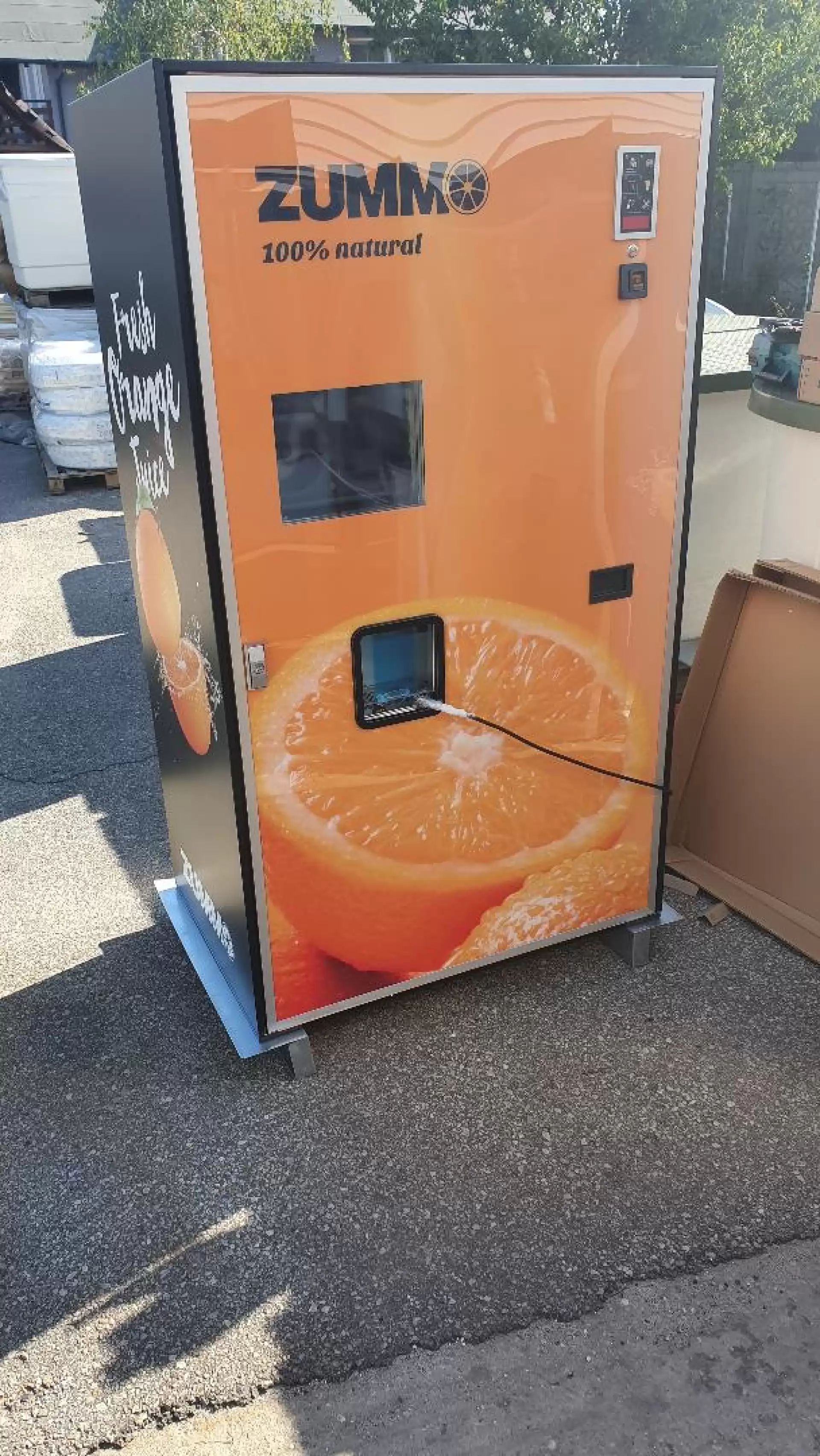 Conexiune la reteaua de apa potabila sau dacă nu este posibil curățarea se face cu apa din bidon Functie de economisire a energiei Programare automata de autocuratare Agent racire: R134A Presiune max. apa: 6 bari Compatibil: Monezi / Cititor bancnote / Sistem de plata cu cardul / Modem Energie: 1.400 W Putere: 220-230 V-50-60 Hz; 100-110 V-50-60 Hz; 240 V-50 Hz Motor cu protectie termica / senzor detectare erori Senzor de usa - opreste mecanismele cand usa este deschisa Greutate: 298 kg Dimensiuni: 1830 x 1000 x 680 mm Ce se vinde ? 3 aparate zummo z 10, aparatele sunt foarte putin folosite (unul e nou), se monitorizează din aplicație unde se văd zilnic numărul de porții vândute și/sau dacă sunt erori ale aparatului. 2 sisteme de stoarcere suplimentare pentru a economisi timp la curățatul acestora adica se înlocuiește sistemul din aparat cu altul curat urmând ca să faci în alta parte curățirea acestora de resturile de portocale.