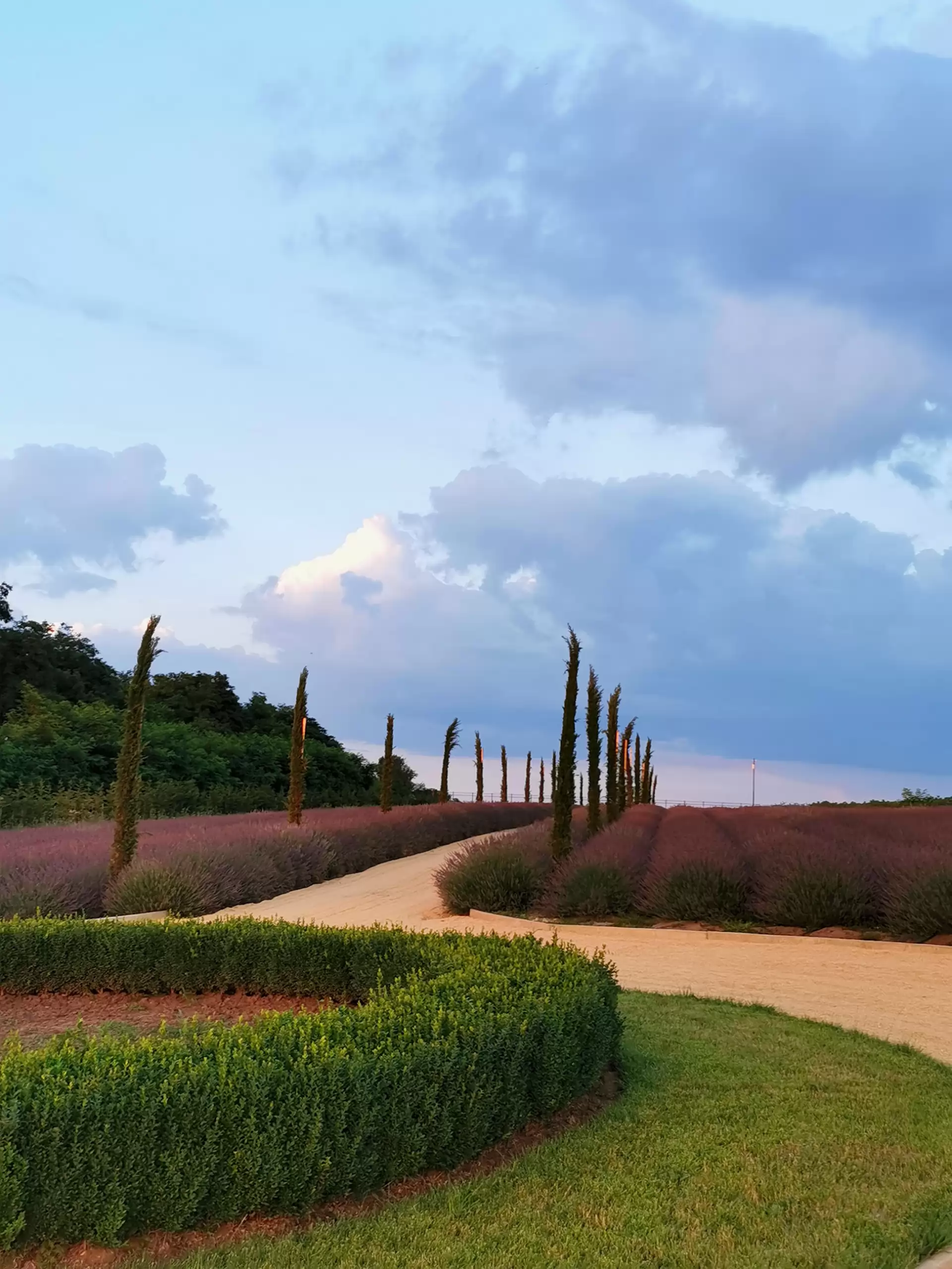 - Drum principal ce trece printr-un camp de lavanda de aproape un hectar si chiparosi adusi din Italia;
