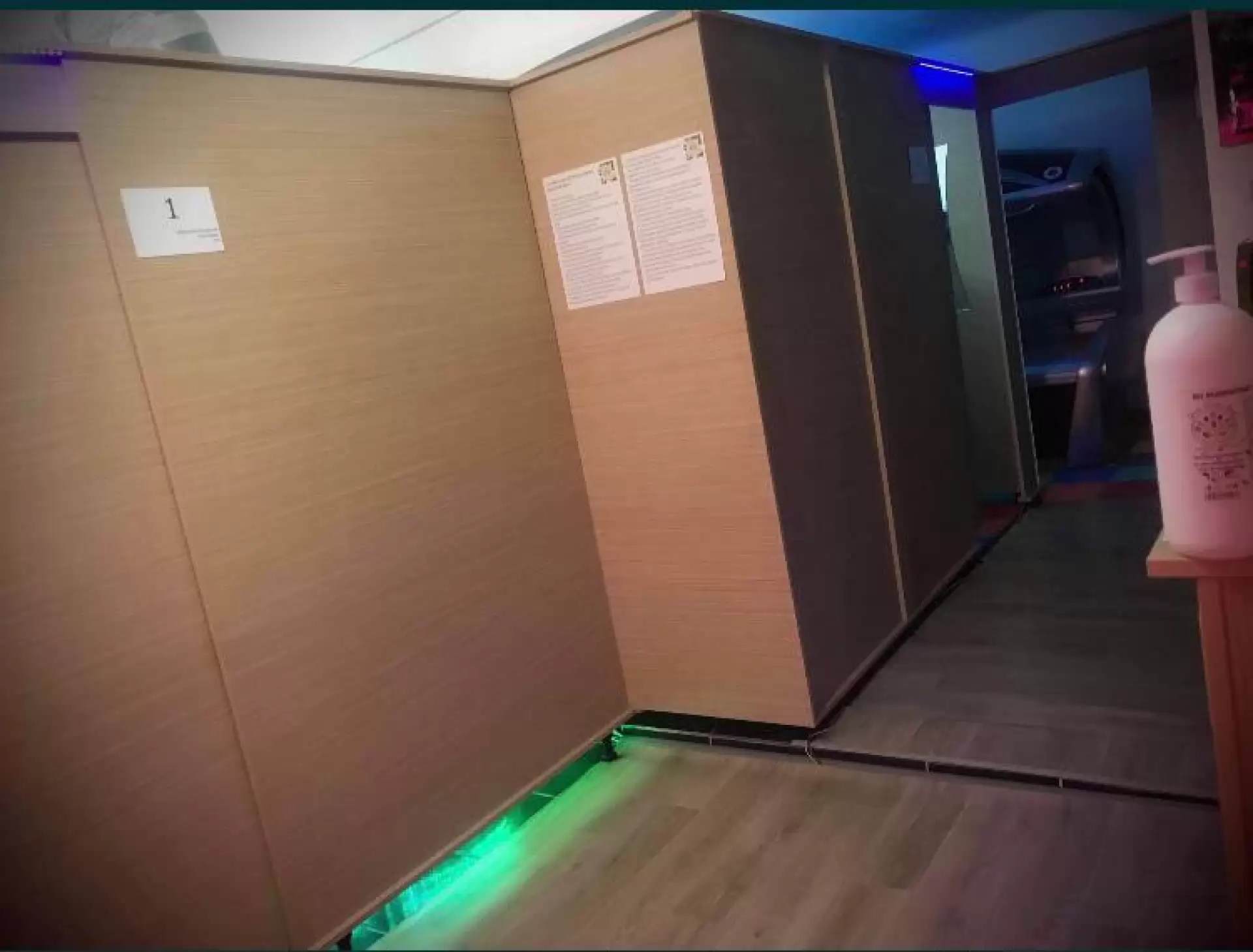 Salon de bronzat cu 3 aparate, 2 tip pat, iar celalt dus. Exista si un al3 lea care poate fi instalat si folosit, tot tip dus.