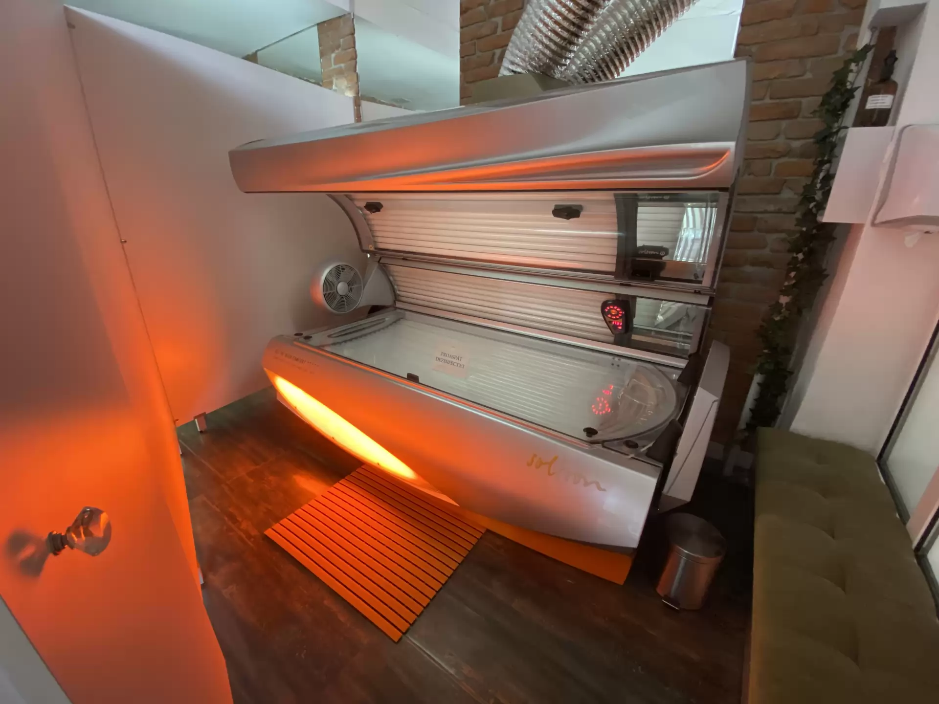 Salon de bronzare dotat cu aparate de bronzare orizontale si verticale, mobilier.