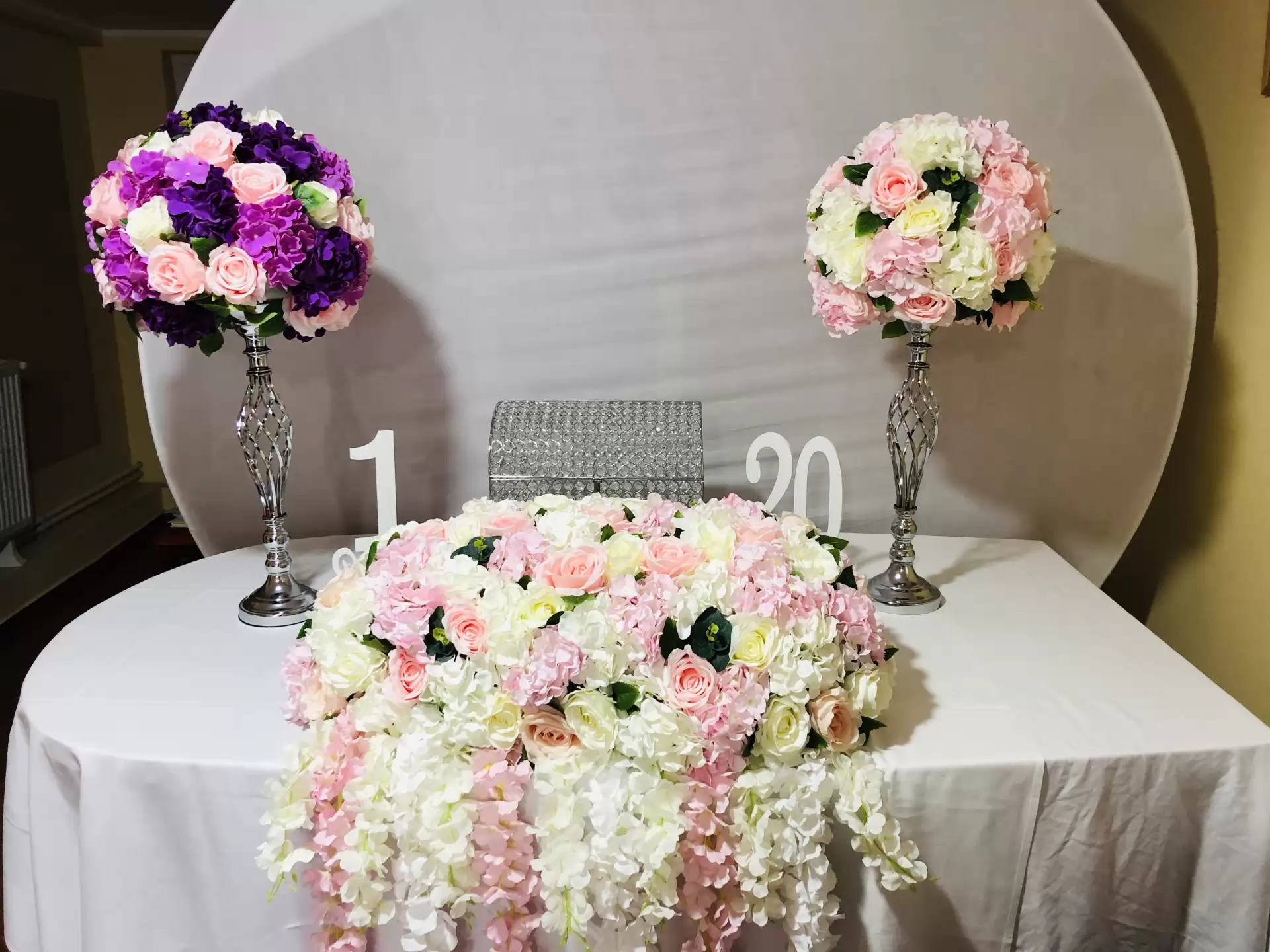 NUNTA -aranjamente tip silk-flowers ( flori de matase) compuse din trandafiri si hortensii pentru mese (15 aranjamente disponibile -300 ron/buc) - + aranjament prezidiu -aranjamente tip silk-flowers (flori de matase) compuse din bujori pentru mese (15 aranjamente disponibile -100 ron buc) - + aranjament prezidiu -sfesnice metal argintii (20 buc disponibile -75 ron buc) -sfesnice metal albe (15 buc disponibile -50 ron buc) -cerc floral de tip photo corner -2000 ron buc -cufar dar -1 buc 300 ron -numere mese (1-20) -100 ron setul Pachet