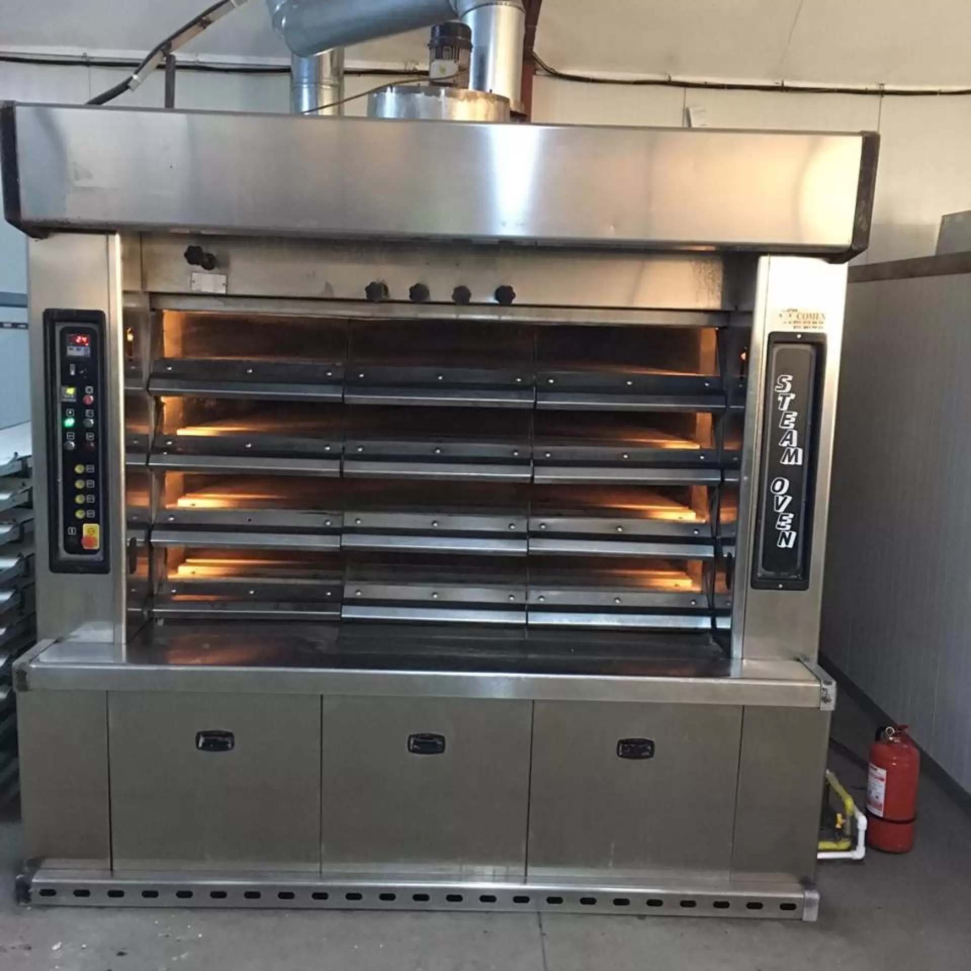 Linia de productie este compusa din: cuptor vatra tuburi anulare marca Bassanina cu suprafata de coacere de 4 mp cu sistem manual de alimentare, malaxor capacitate 100 kg aluat , dospitor cu unitate de climatizare , camera frigorifica 5 mp , divizor hidraulic