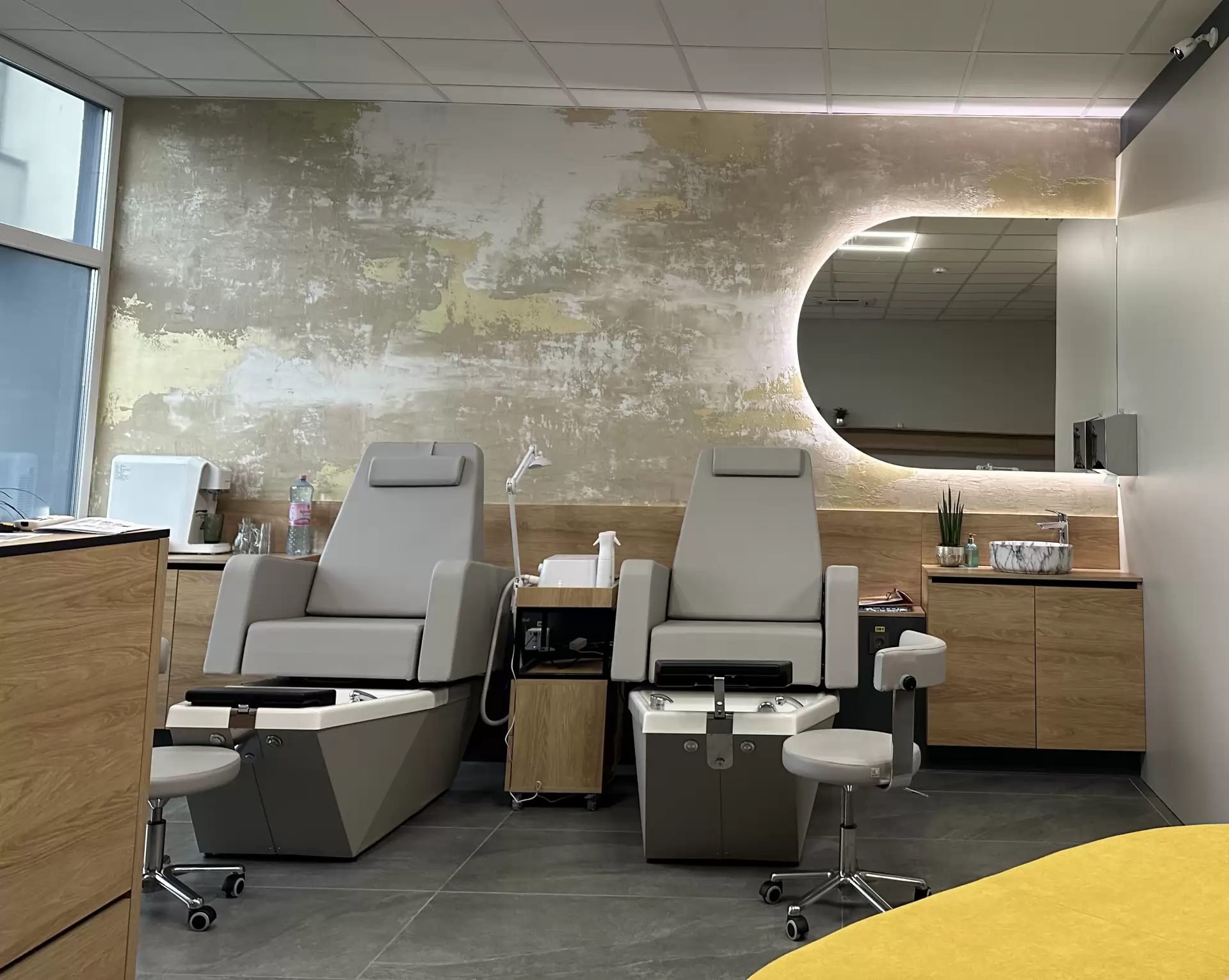 Salonul este dotat cu doua fotolii de pedichiura noi - Nillo. De asemenea are si 4 mese de manichiura dotate cu mandrine noi, suport maini client, veioza, lampa UV, si doua aspiratoare de praf.