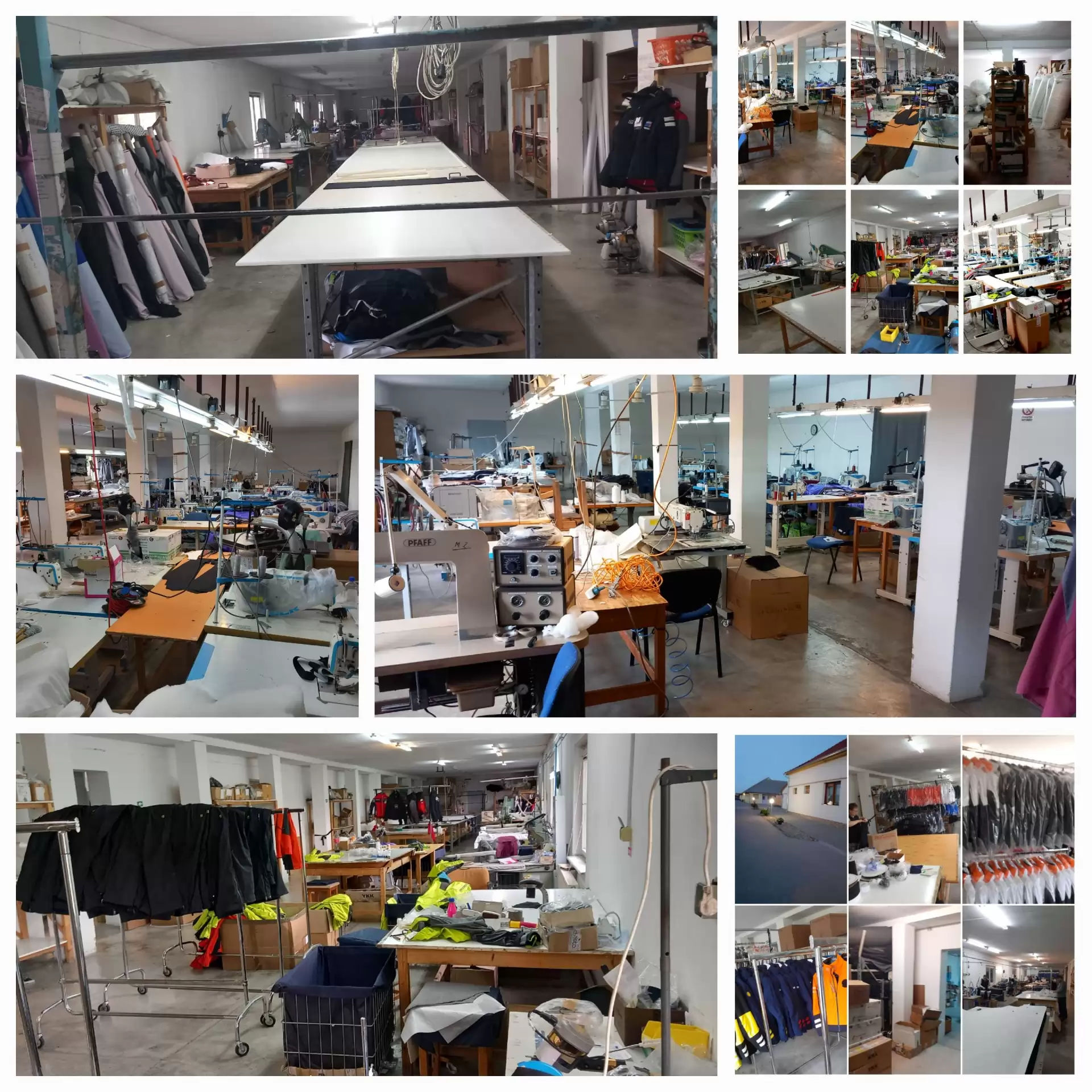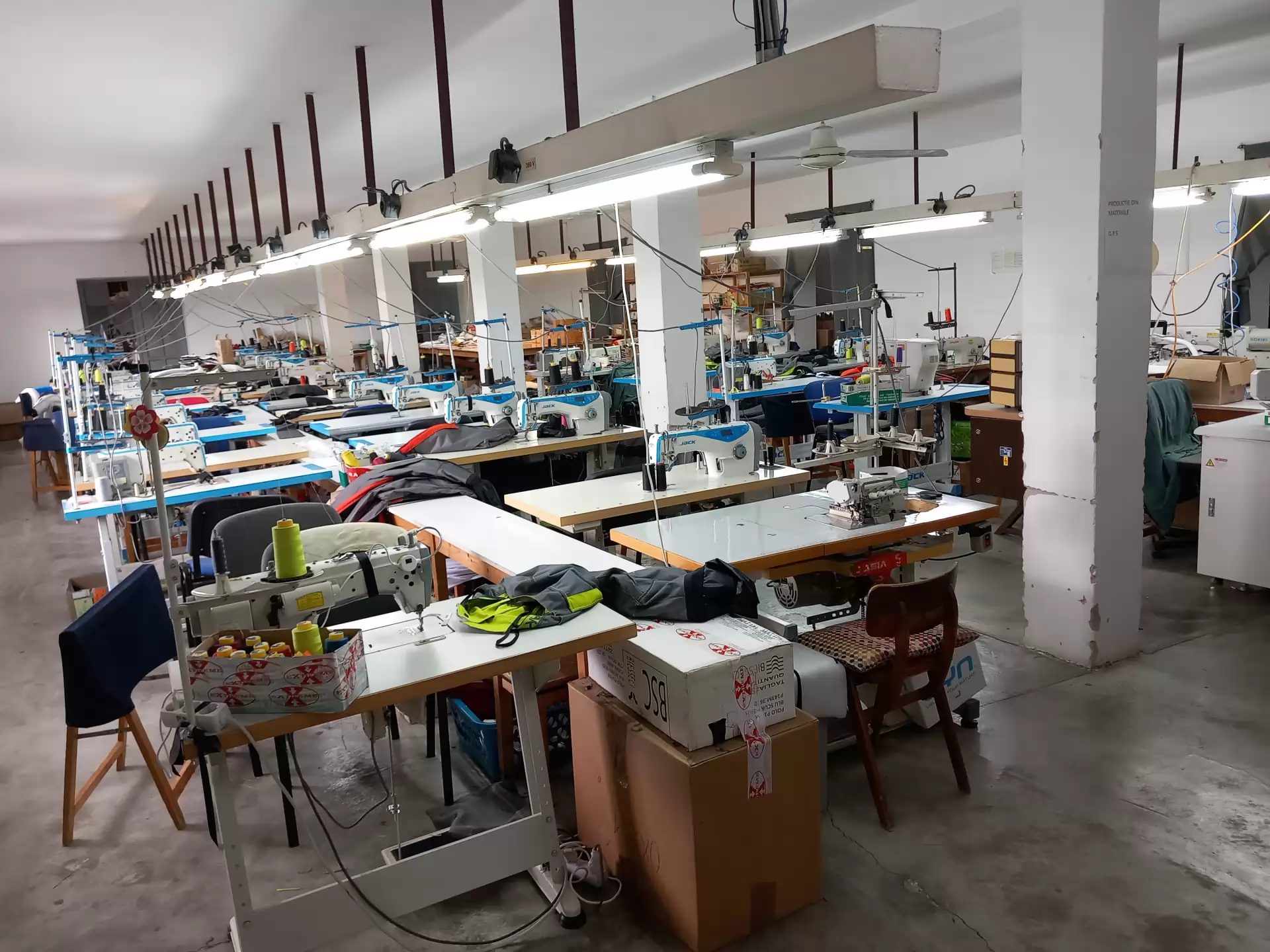 Avem in dotare 50 masini de cusut industriale cu o vechime de 3 ani, masini speciale, 3 masini de lipit benzi pe cusaturi pentru impermeabilitate, prese aplicat transferuri, mese de calcat si generatoare de abur 2 bandzicuri pentru croit, 3 masini de croit portabile, masina de umplut cu puf, masini pneumatice de aplicat butoni plus mobilierul aferent.