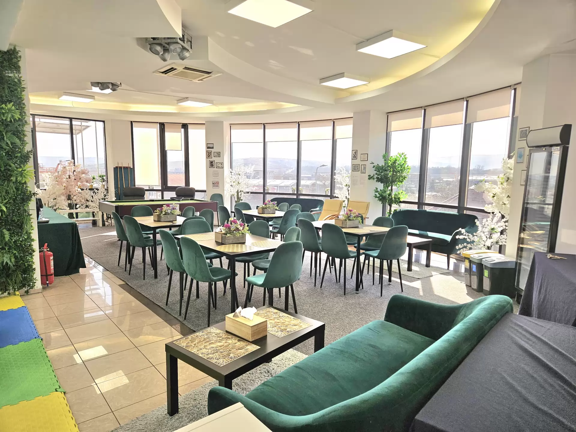 Locația are design modern, este dotată cu încălzire în pardoseală și aer condiționat, și oferă un spațiu confortabil dedicat părinților, cu: mese și scaune fotolii cu masaj masă de biliard.
