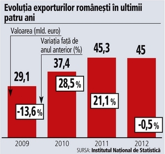 Performanţa exporturilor româneşti în perioada crizei reprezintă un caz atipic, ce a făcut obiectul unei cercetări academice care a scos la iveală punctele tari, punctele slabe, vulnerabilităţile, dar şi oportunităţile României în materie de exporturi.