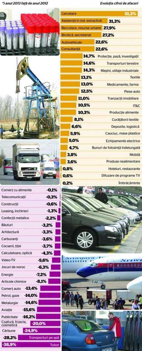 "Adevărul" a analizat şi evoluţiile cifrelor de afaceri din 2012 faţă de 2011, astfel că vă putem arăta ce schimbări structurale au intervenit intre timp. In primul rand, doar 12 din cele 48 de domenii au ieşit pe minus in 2012, iar creşterile au fost dominate de serviciile de leasing şi inchirieri. Cercetarea (care acum domină topul creşterilor) era a treia in topul scăderilor. Atat industriile, cat şi serviciile care le insoţesc au avut afaceri in creştere (de exemplu, construcţiile şi tranzacţiile imobiliare, respectiv producţia şi comerţul cu alimente etc.). De la minus in 2012 la plus in 2013 au trecut cercetarea, turismul, serviciile de protecţie şi pază şi difuzarea de programe TV, iar de la plus la minus au trecut leasingul, telecomunicaţiile, construcţiile şi comerţul cu carburanţi.