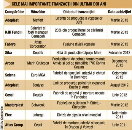 Din dorinţa de formare a unor companii puternice, care să reziste împotriva crizei, producătorii din zona de mortare, adezivi şi vopsele; cu resurse financiare au început să „înghită“ afaceri mai mici sau să fuzioneze cu propriii concurenţi. Mişcările s-au intensificat spre finalul anului trecut şi începutul acestui an, când au avut loc şase tranzacţii importante între producători